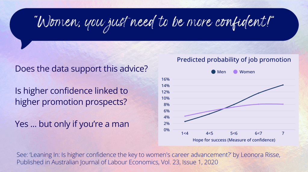 Risse, L. (2020) ‘Leaning in: Is higher confidence the key to women’s career advancement?’ Australian Journal of Labour Economics 23(1): 43-78 🔗